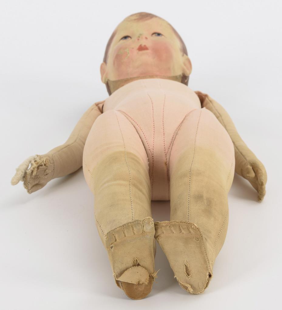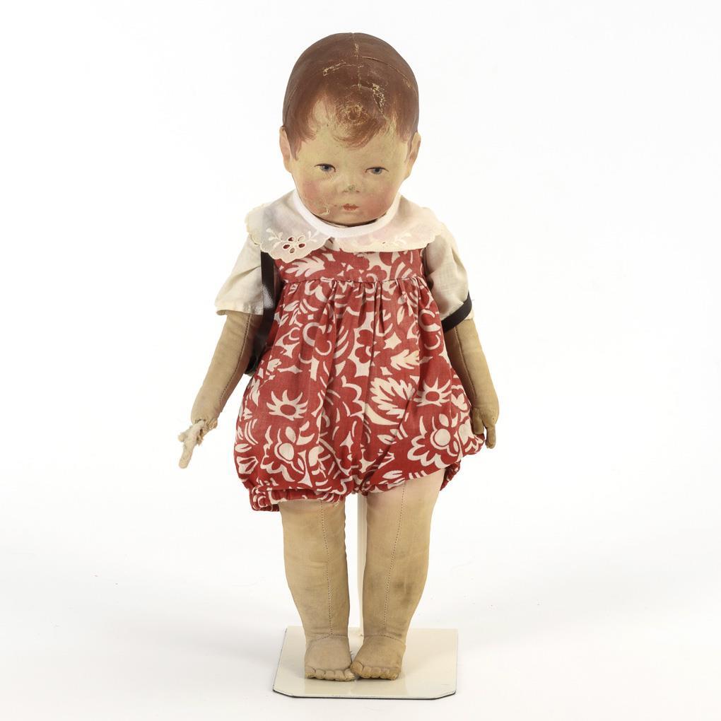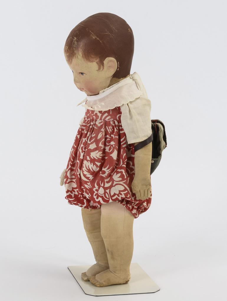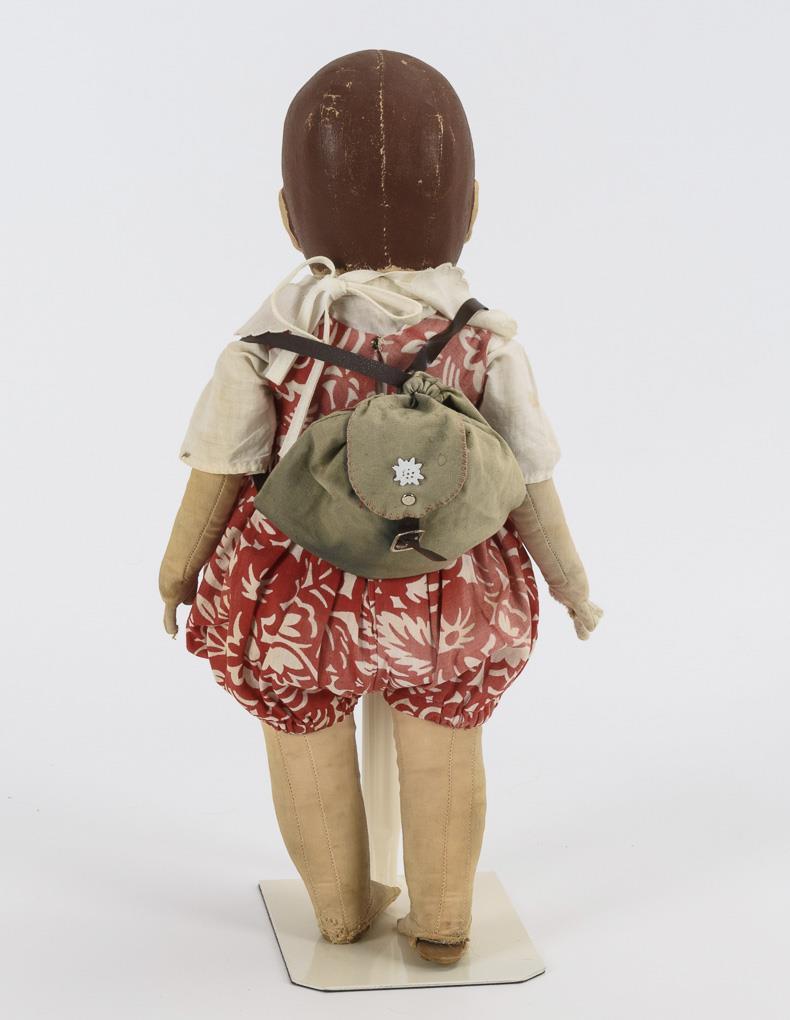 Maskenartig bemalter, fest angenähter Kopf mit 3 Hinterkopfnähten und gemalten Haaren. Körper mit breiten Hüften, 5 Beinnähten und einzeln angenähtem Daumen. Rotes Spielhöschen, Wanderrucksack. Kopf leuchtet nicht unter UV. Mit Defekten an Wange, rechter Hand und Füßen.