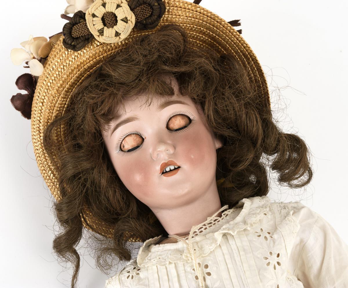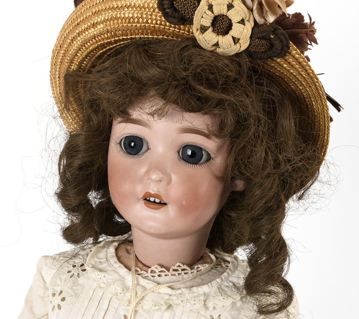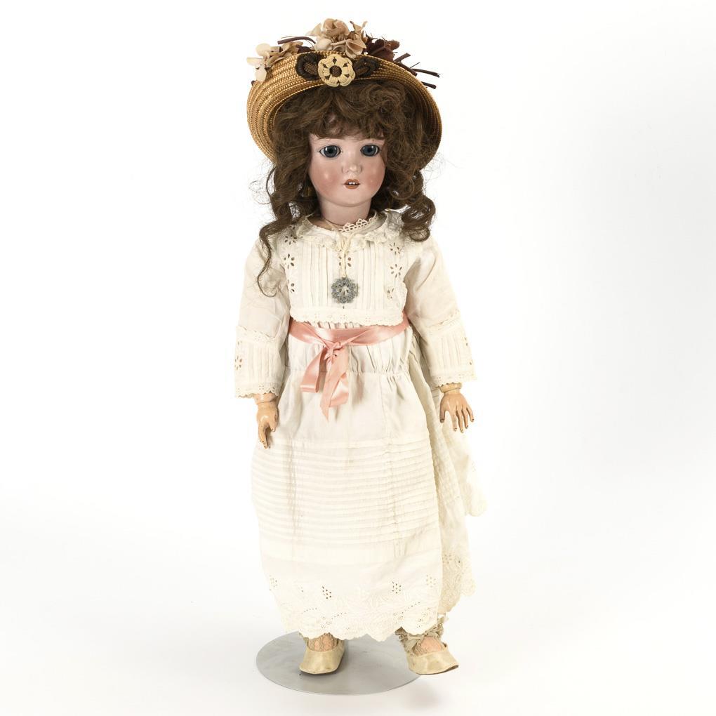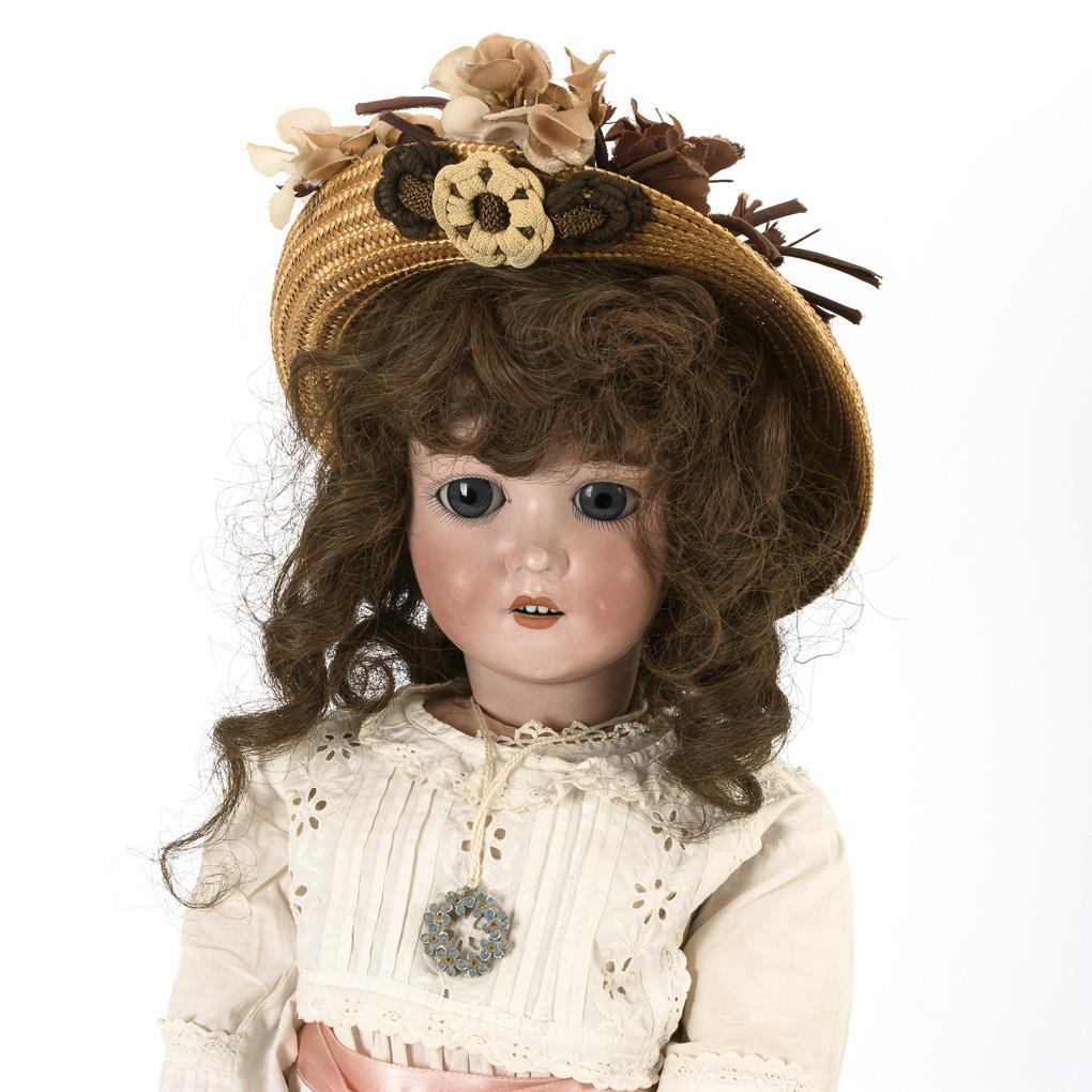 Kurbelkopf, blaue Schlafaugen, braune Lockenperücke. 15-teiliger Gliederkörper. Weißes Kleid mit rosa Schleife, Strohhut mit Blumenschmuck, weiße Stoffschuhe. Kopf mit kleinem Chip am linken oberen Augenrand, seitliche Kopfnähte brandrissig. Körper partiell übermalt.