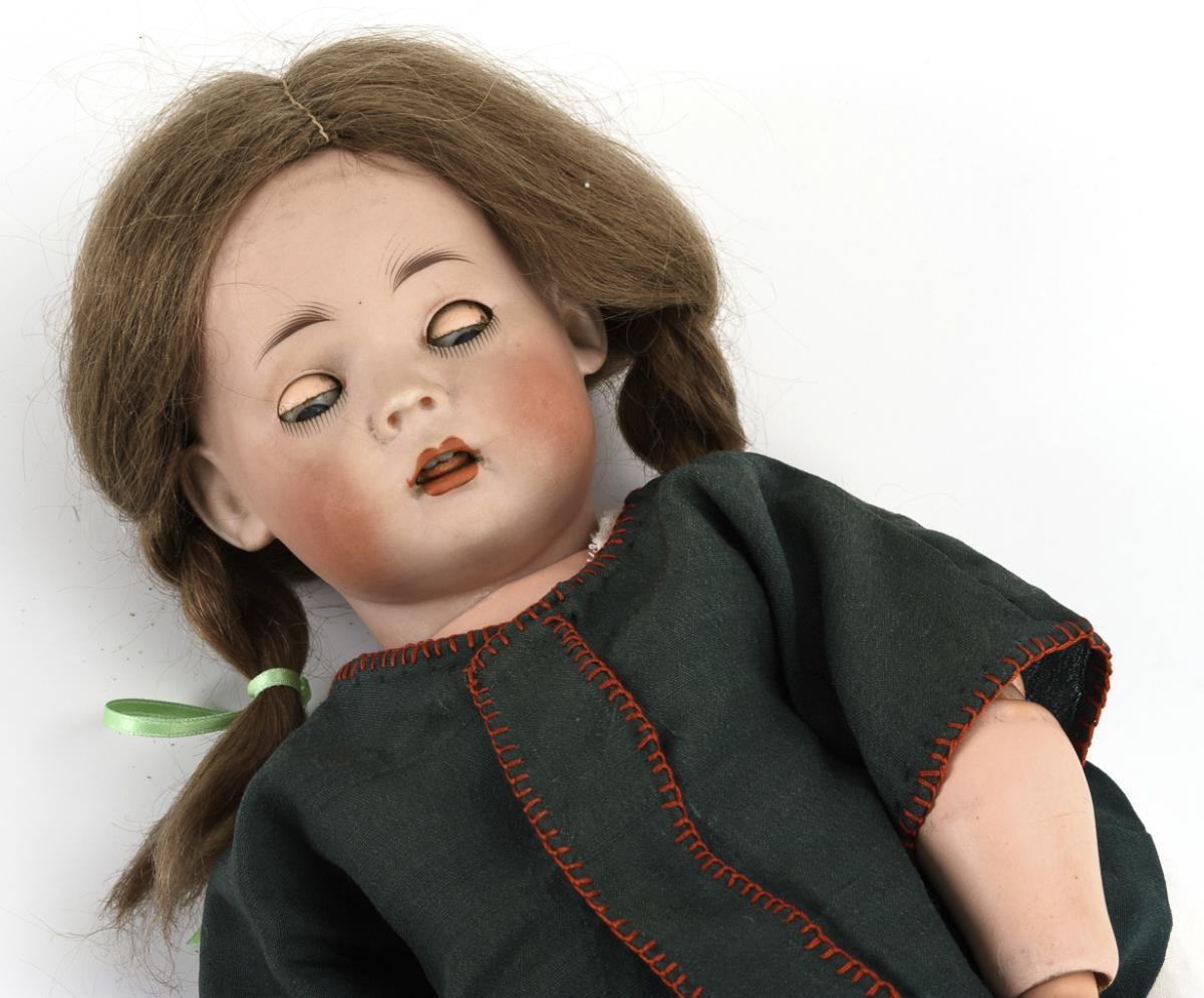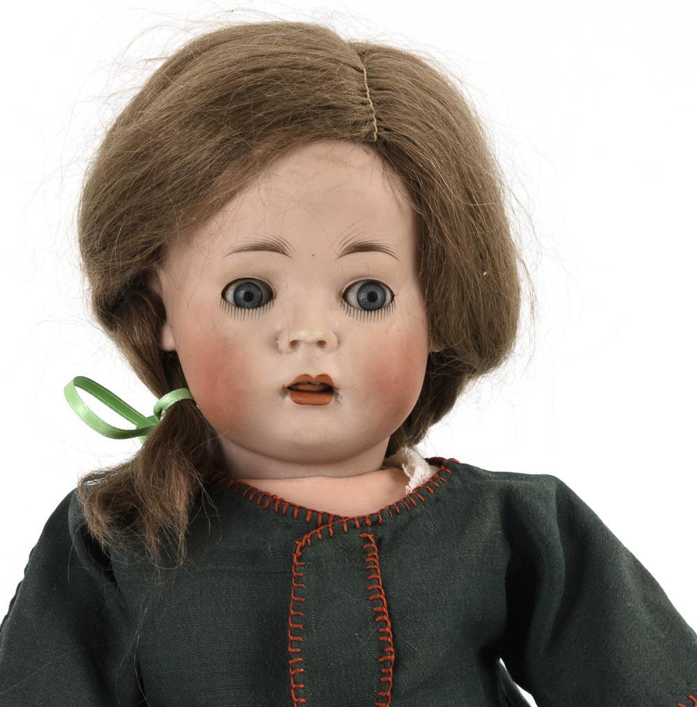 Kurbelkopf, blaue Schlafaugen, bewegliche Zunge, dunkelblonde Mohairperücke mit Zöpfen. 15-teiliger Toddlerkörper. Weißes Kleid, grüne Jacke, weiße Lederschuhe. Kopf durchleuchtet: ohne Defekte, lediglich 1 kleiner Perückenpull und winziger Brandriss im linken Augenwinkel.