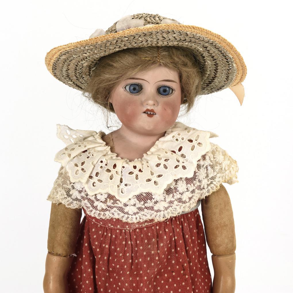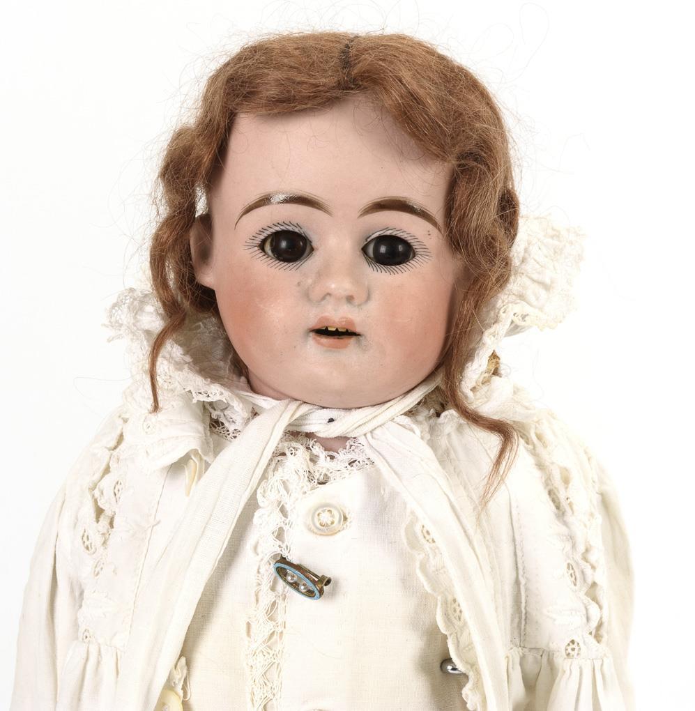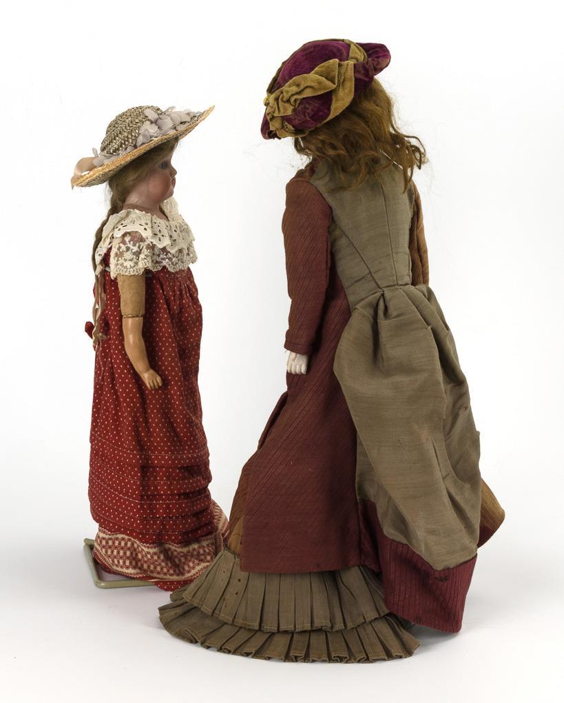 Jeweils mit Brustkopf, Schlafaugen, Mohairperücke. Körper aus Stoff und Leder, Unterarme aus Biskuit bzw. Celluloid. Altersspuren und Defekte. Heubach-Mädchen mit weißem Kleid: Kopf mit Rissen, 1 Hand ergänzt. AM 370 im roten Kleid: kleine Chips an den Augenausschnitten, linke Hand defekt. Florodora im braunen Kleid: linke Hand defekt.