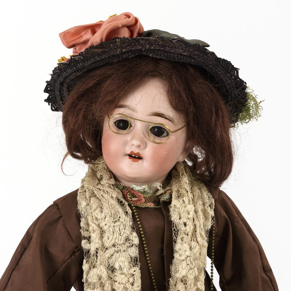 Braunes Kleid, Strohhut, Brille, schwarze Schuhe. Dazu 1 jüngerer Schirm. Altersspuren, kleine Defekte.