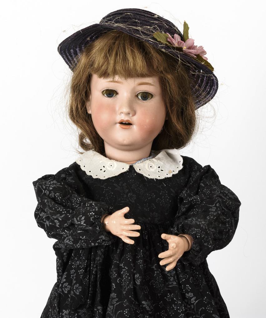 Kurbelkopf, blaue Schlafaugen, hellbraune Kunsthaarperücke, 15-teiliger Gliederkörper, dunkelblaues Kleid mit weißen Pünktchen. / Defekter Kurbelkopf, blaue Schlafaugen, Wimpern, mittelblonde Kunsthaarperücke, 17-teiliger Gliederkörper, schwarzes Kleid mit weißem Kragen. / Brustkopf, feste braune Augen, blonde Perücke mit Zöpfen, Lederkörper mit Unterarmen aus Celluloid, rosa Kleid. Altersspuren, Reparaturen und Defekte.