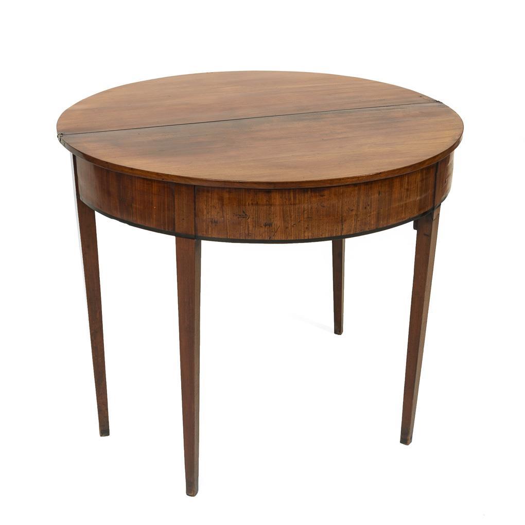 Halbmondartiger Wand-Klapptisch auf 4 Pfeilerbeinen, mit schwenkbaren hinteren Beinen zur Stabilisierung der klappbaren Tischplatte, glatte Zarge mit ebonisiertem Band; in einem hinteren Bein verstecktes Fach. Alt restauriert mit kleinen Ergänzungen, Alters-/Gebrauchsspuren.