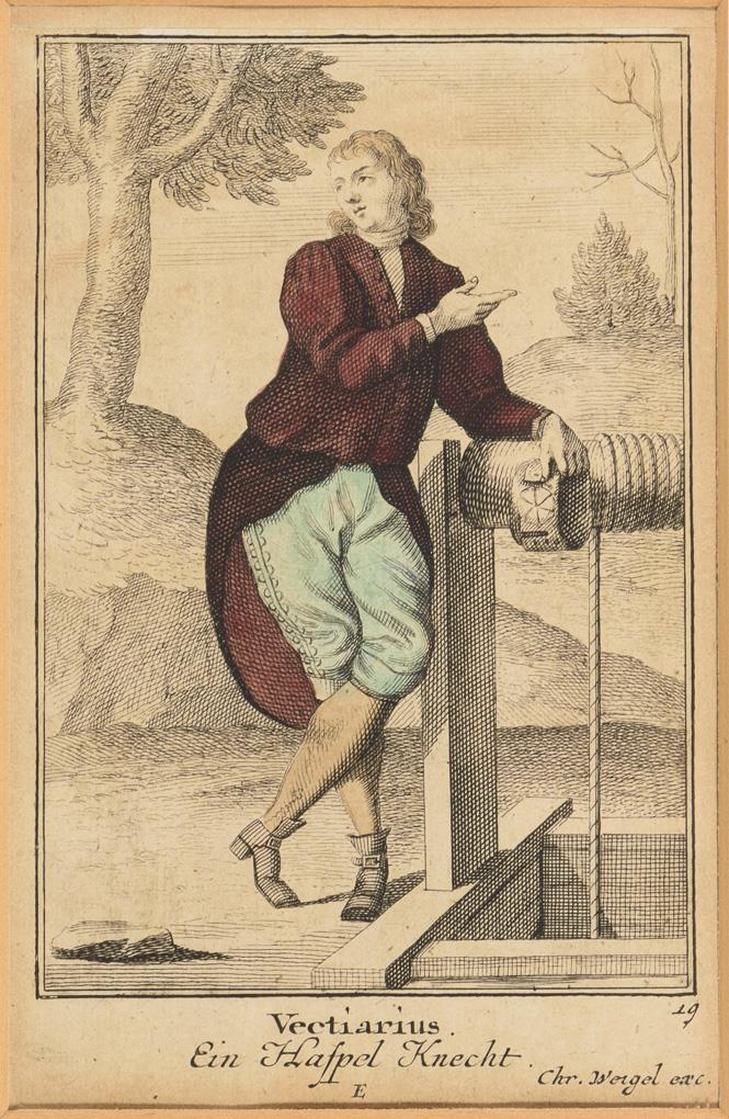 Blatt 19 "Vectiarius - Ein Haspel Knecht", aus: "Abbildung und Beschreibung derer sämtlichen Bergwerks- und Schmelzhüttenbeamten und Bedienten nach ihrem gewöhnlichen Rang und Ordnung im behörigen Berghabit [...] “, 1721. Blatt mit Lichtschaden.