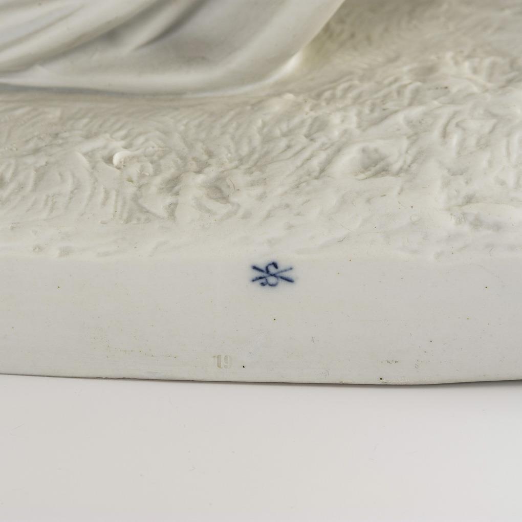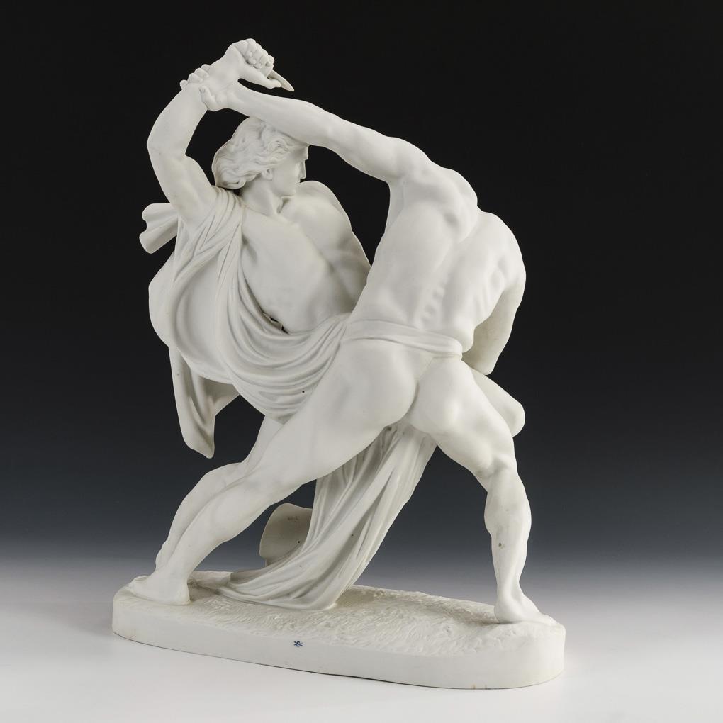 Ausdrucksstarke Plastik von zwei miteinander ringenden, mit Dolchen bewaffneten Männern. Am Bauch minimal restaurierter Brandriss, unterseitig minimaler Chip am Sockel.
