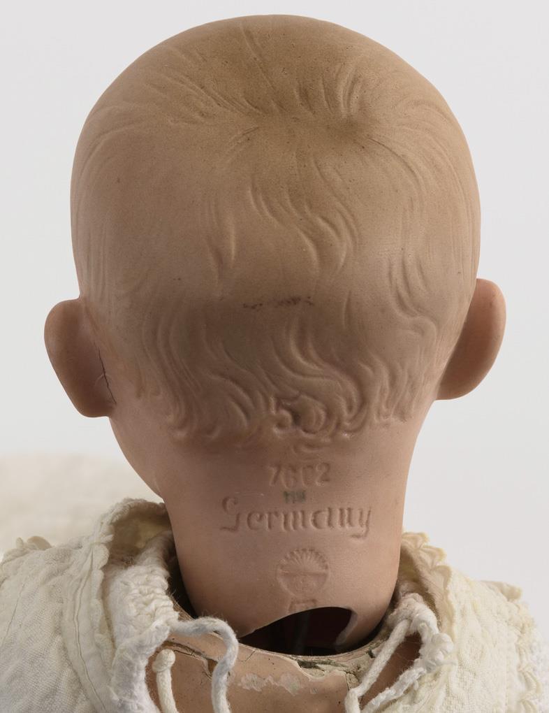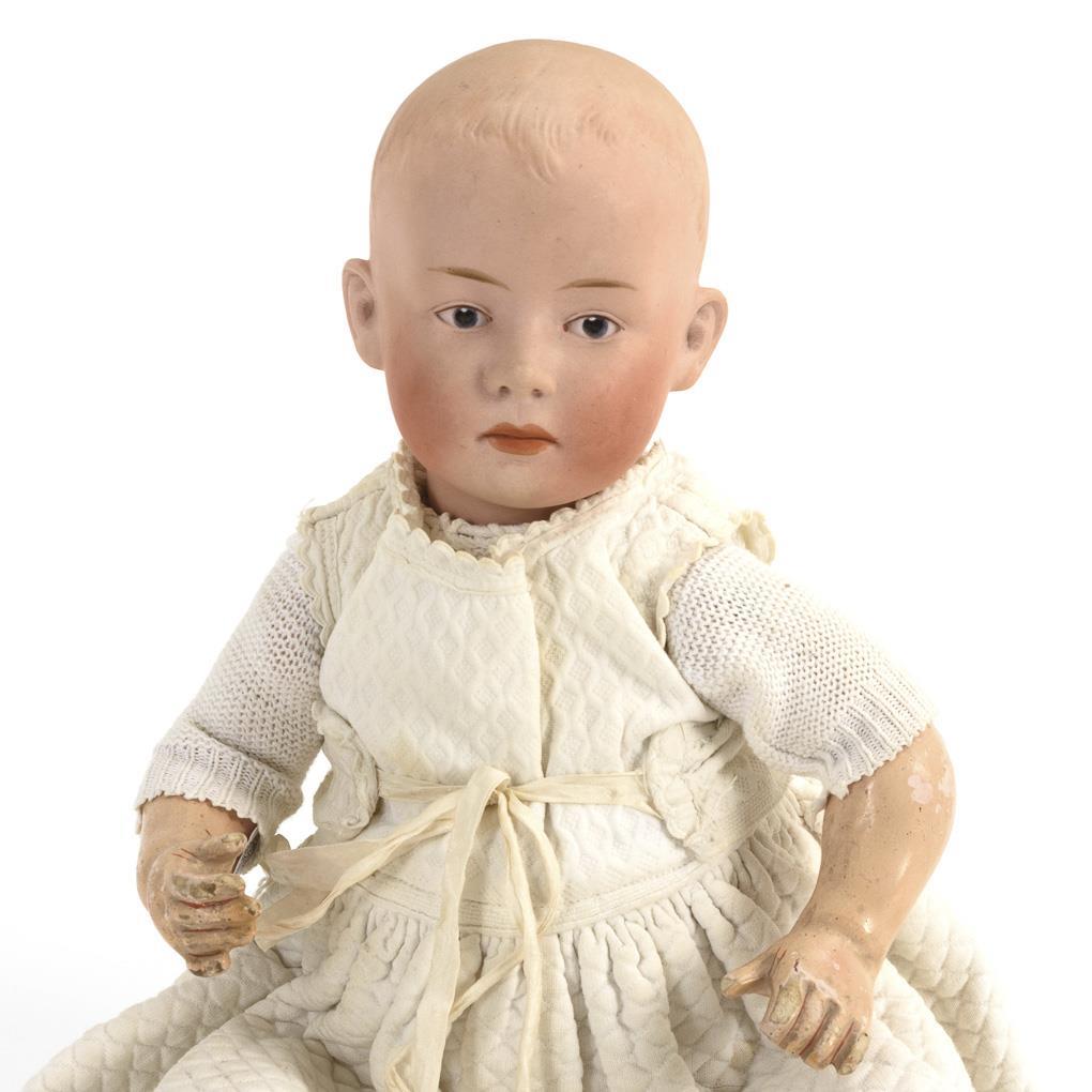 Kurbelkopf, gemalte Intaglio-Augen, modellierte Babyhaare. 5-teiliger Sitzbabykörper. Weißes Kleid. Ausbruch an der Halskurbel. Körper mit Trockenriss und partiellem Farbabrieb.
