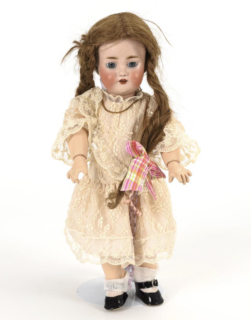Kurbelkopf, nachgegipste blaue Glasaugen, offene Nasenlöcher, hellbraune Echthaarperücke mit Zöpfen. 13-teiliger Gliederkörper. Weißes Spitzenkleid, schwarze Schuhe. Kopf durchleuchtet: ohne Defekte. Körper komplett übermalt.
