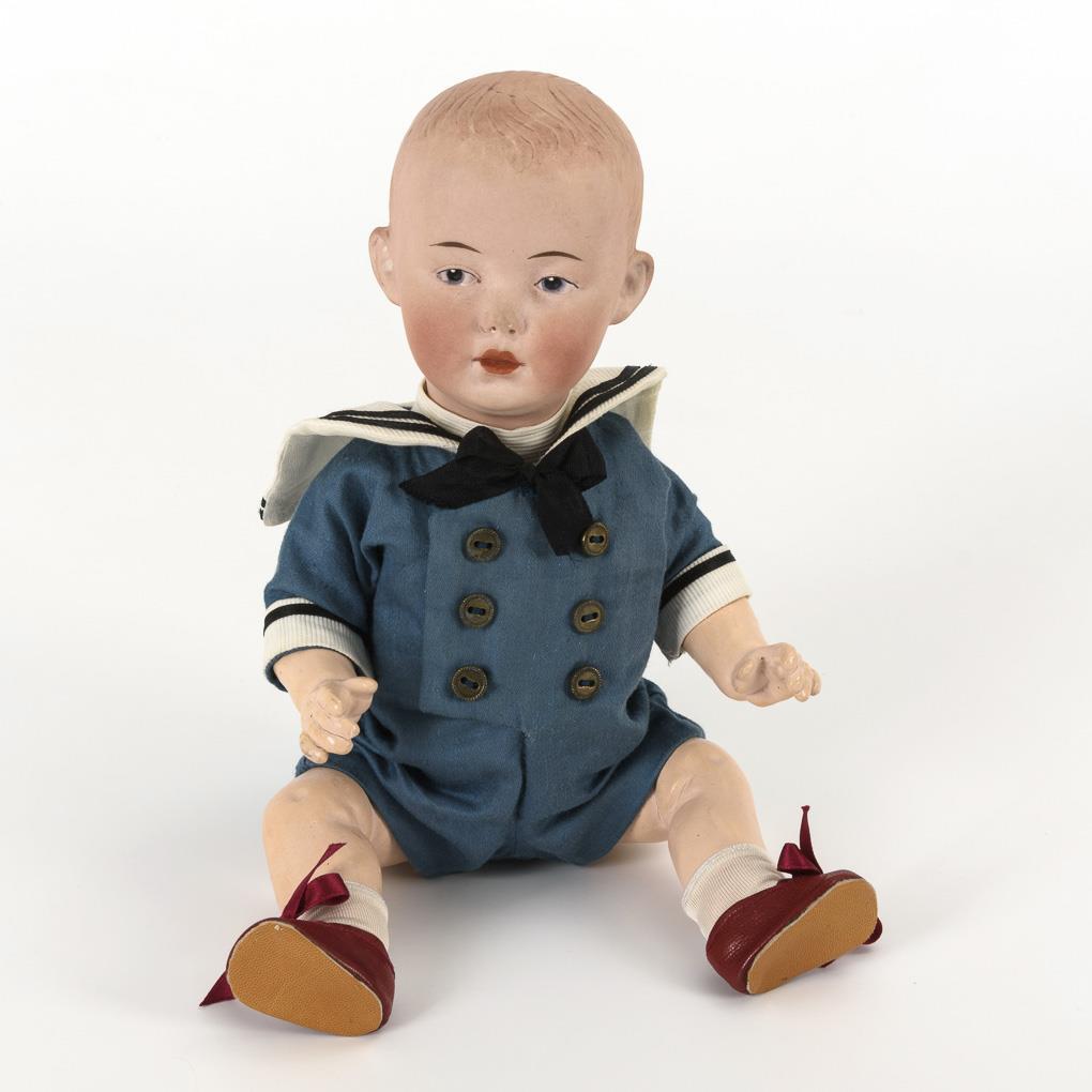 Kurbelkopf, gemalte Intaglio-Augen, modellierte Babyhaare. 5-teiliger Sitzbabykörper. Blauer Matrosenanzug, rote Schuhe. Keine Defekte am Kopf sichtbar. Hände und Füße übermalt.