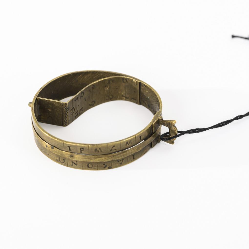 Gedruckte Bezeichnungen innen, Eisen-Balkenwaage mit Messing-Schalen, Gewichte und 3 Ausgleichsgewichte. / Bauernring mit Monats-Buchstaben außen und drehbarem Reifen sowie Stundenskala innen. Defekte Scharniere und kleiner Ausbruch, 1 Gewicht fehlt. Alters-/Gebrauchsspuren.