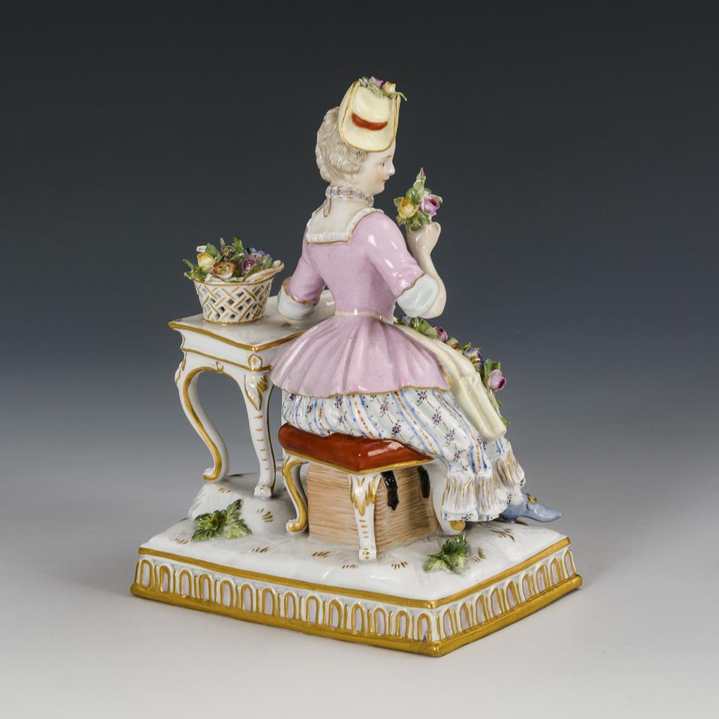 An einem Tisch mit Blumenkorb sitzende Dame, an einem Blumenstrauß riechend. 1 Korbhenkel bestoßen, einige Blüten und Blätter bestoßen.