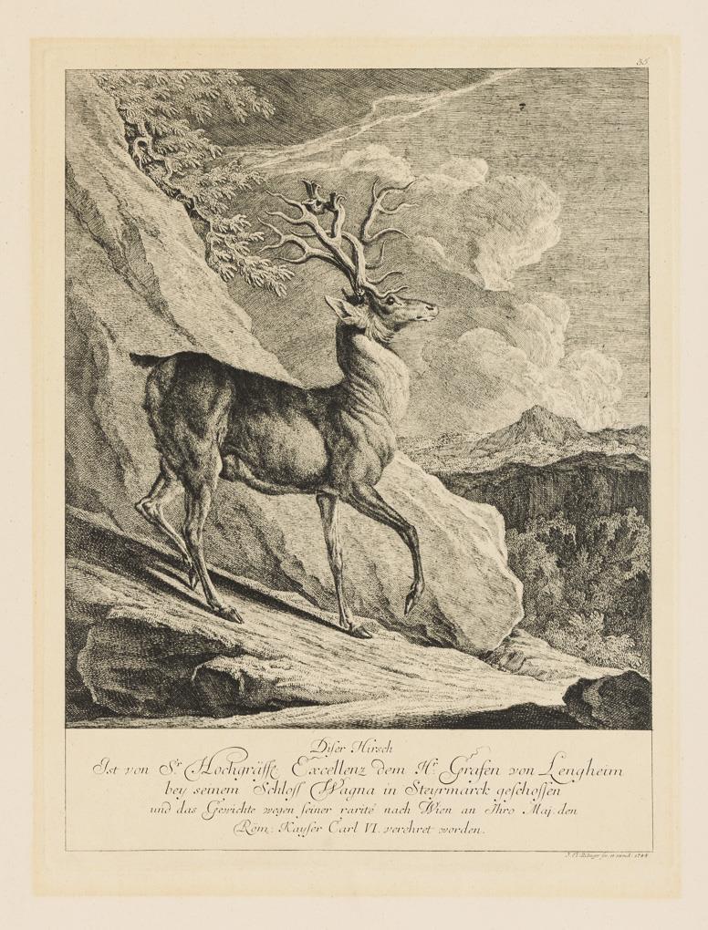 "Wie die Hirschen in dem Brudel beschlichen und gepürschet werden", Platte: 26,5 x 37 cm, Blatt: 34,5 x 45,5 cm, eine hinterklebte Stelle, stockfleckig, Lichtschaden | "Ein iagtbahrer Bürghirsch von 10. Änden [...]", Blatt: 34 x 41 cm, Blatt beschnitten, Lichtschaden, hinterklebter Riss im unteren Randbereich | "Diser Hirsch Ist von Sr. Hochgräffl. Excellenz [...]", Platte: 37 x 28 cm, Blatt: 46,5 x 36 cm, Lichtschaden, wohl jüngerer Nachdruck.