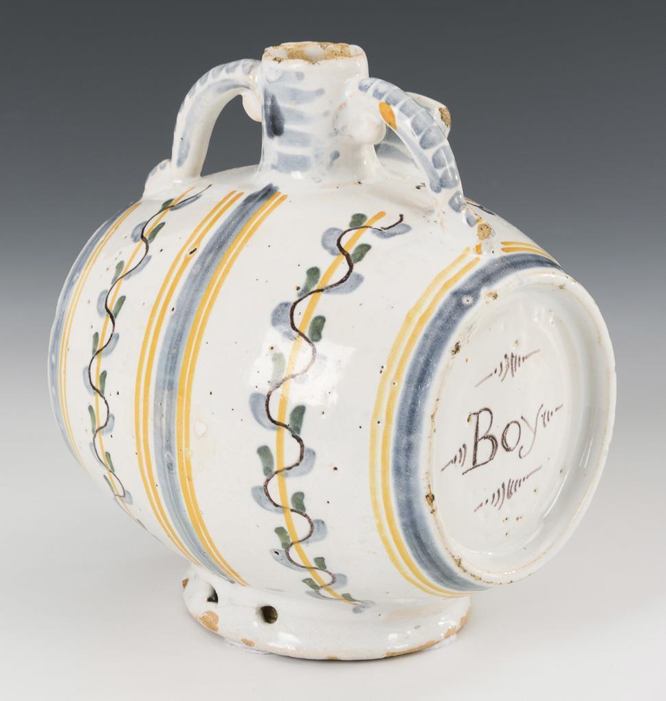 Rundes Fässchen mit Enghals und 2 volutierten Henkeln sowie seitlicher Tülle (ohne Stöpsel). An den Seiten bezeichnet "Boy" (wohl von französisch "boire"/"trinken"). Partiell kleinere Bestoßungen.