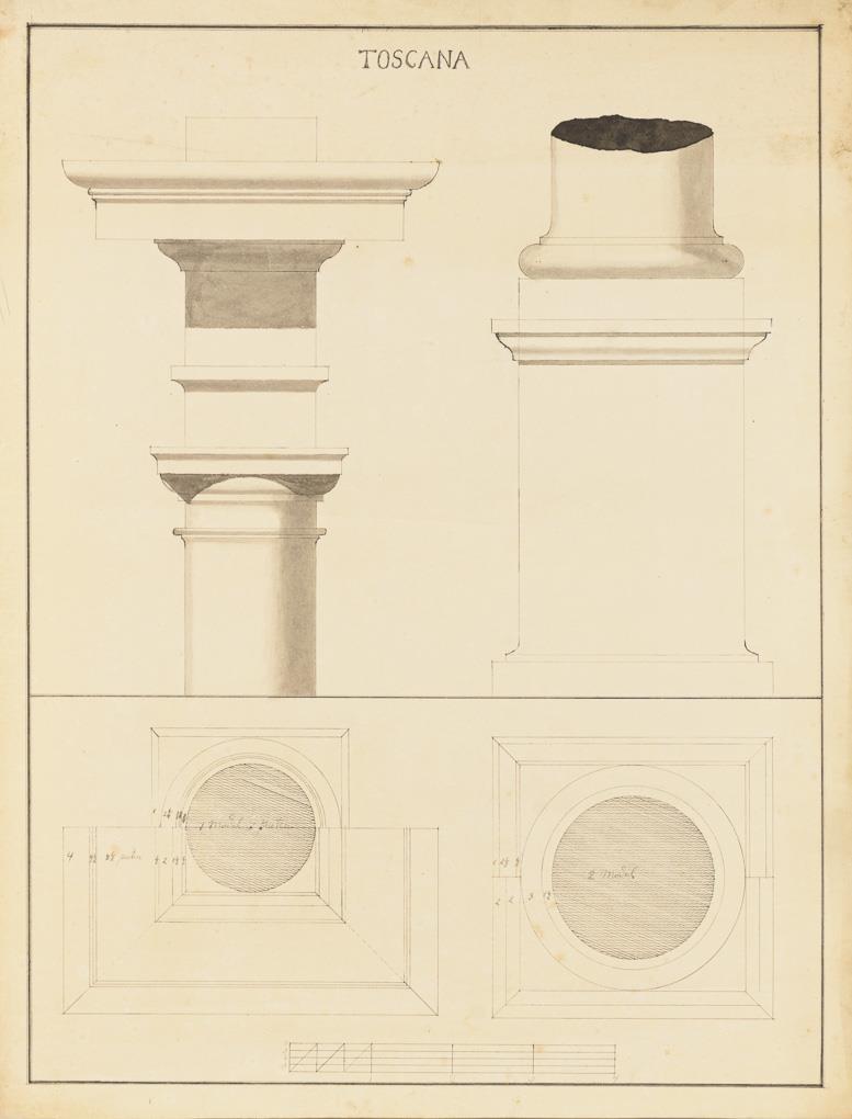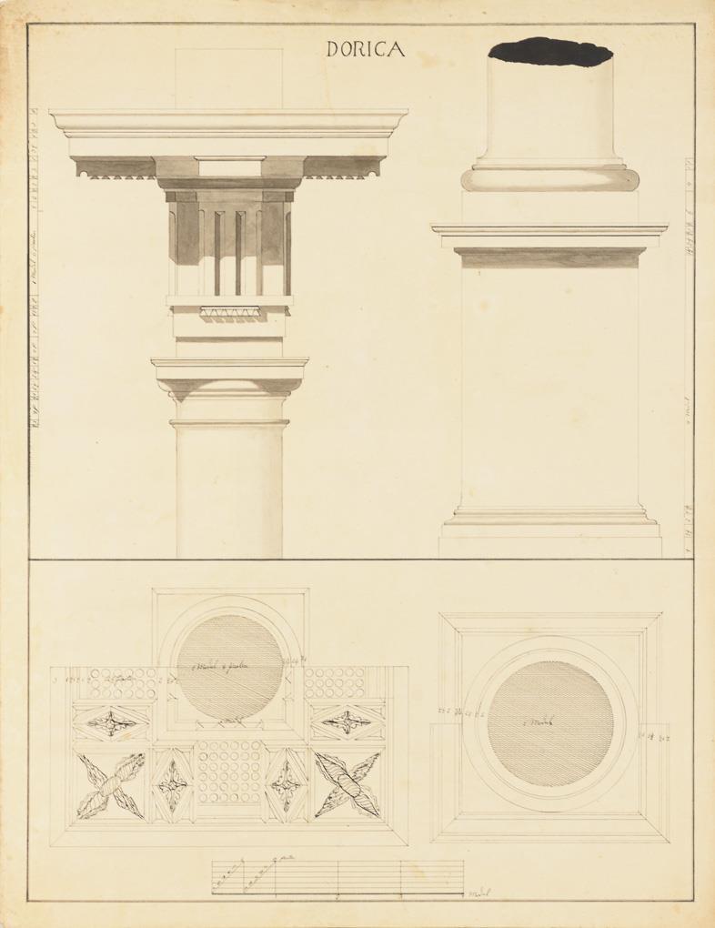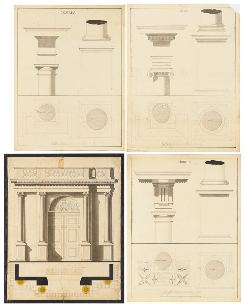 1 Portalentwurf mit vorgestellten Säulen und 3 Entwürfe mit dorischen "Dorica", ionischen "Ionica" und toskanischen "Toscana" Säulen mit Kapitell, Basis, Unteransicht und Querschnitt, je mit Maßstabsangabe. Teils hinterklebt, griff- und knickspurig, stockfleckig.