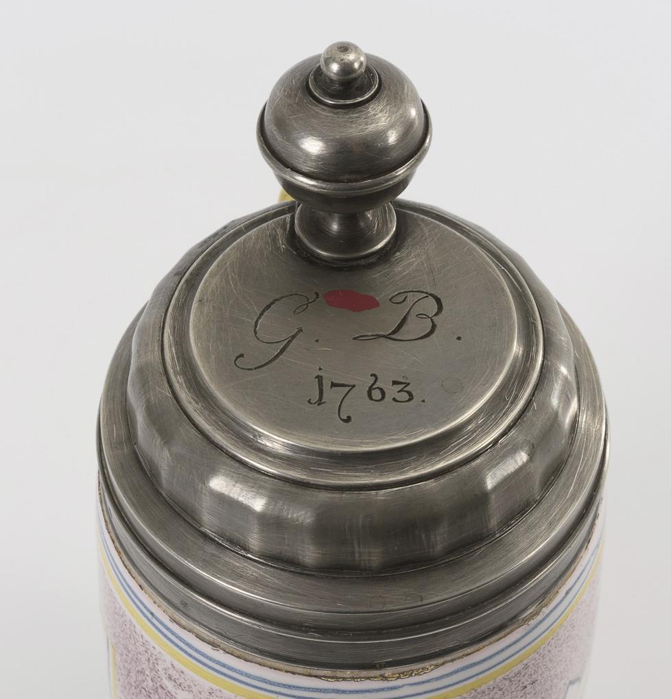 Zylinderkrug mit manganjaspierter Wandung und ergänztem gelben Bandhenkel. Auf der Wandung 3 Reserven mit architektonischem Motiv und Blumenmalerei. Profilierter Zinndeckel mit Kugeldrücker, graviert "GB" und datiert "1763", innen gepunzt, Zinnstandring. Henkel restauriert, an Mündung innen leicht bestoßen.