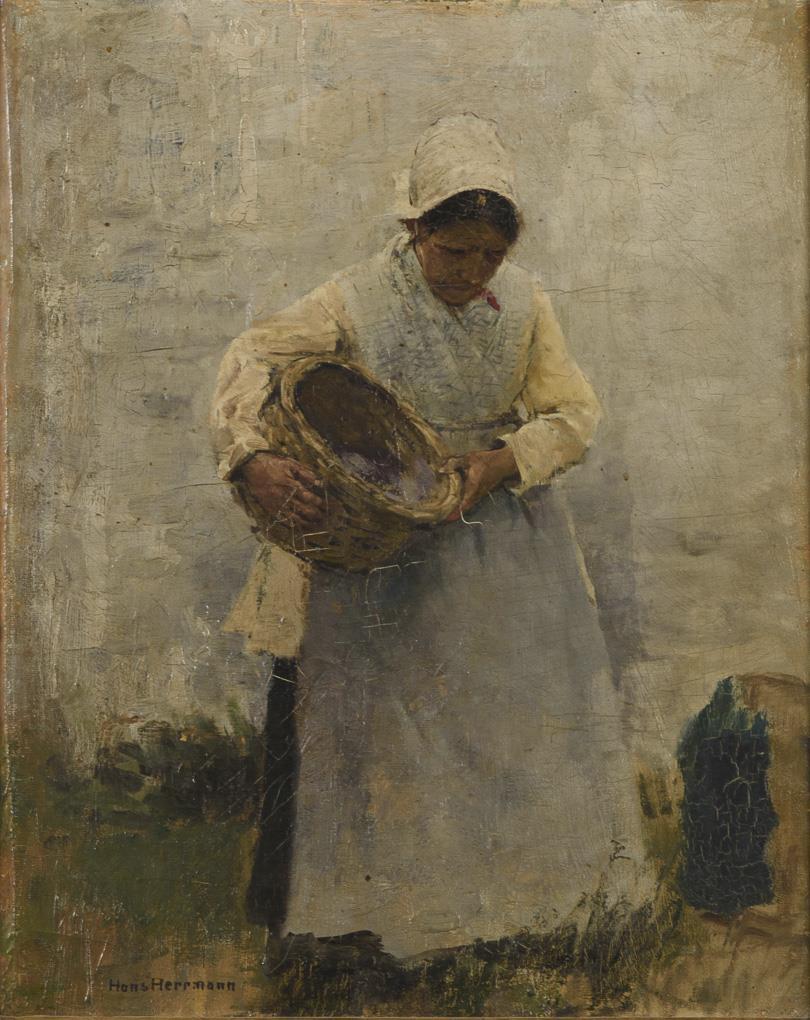 Wohl holländische Frau mit Korb vor grauer Wand. Altersspuren.