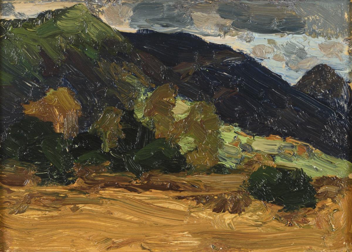 Expressive Landschaftsstudie mit Feld vor einem Wald und den Bergen unter wolkigem Himmel. Nachtrag 14.2.22: Brändel lebte bis 1945. Er starb in Herrsching am Ammersee.