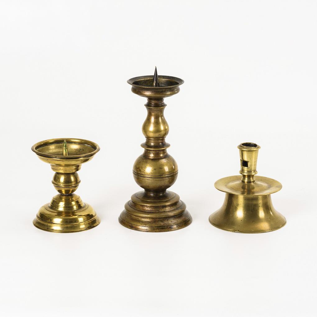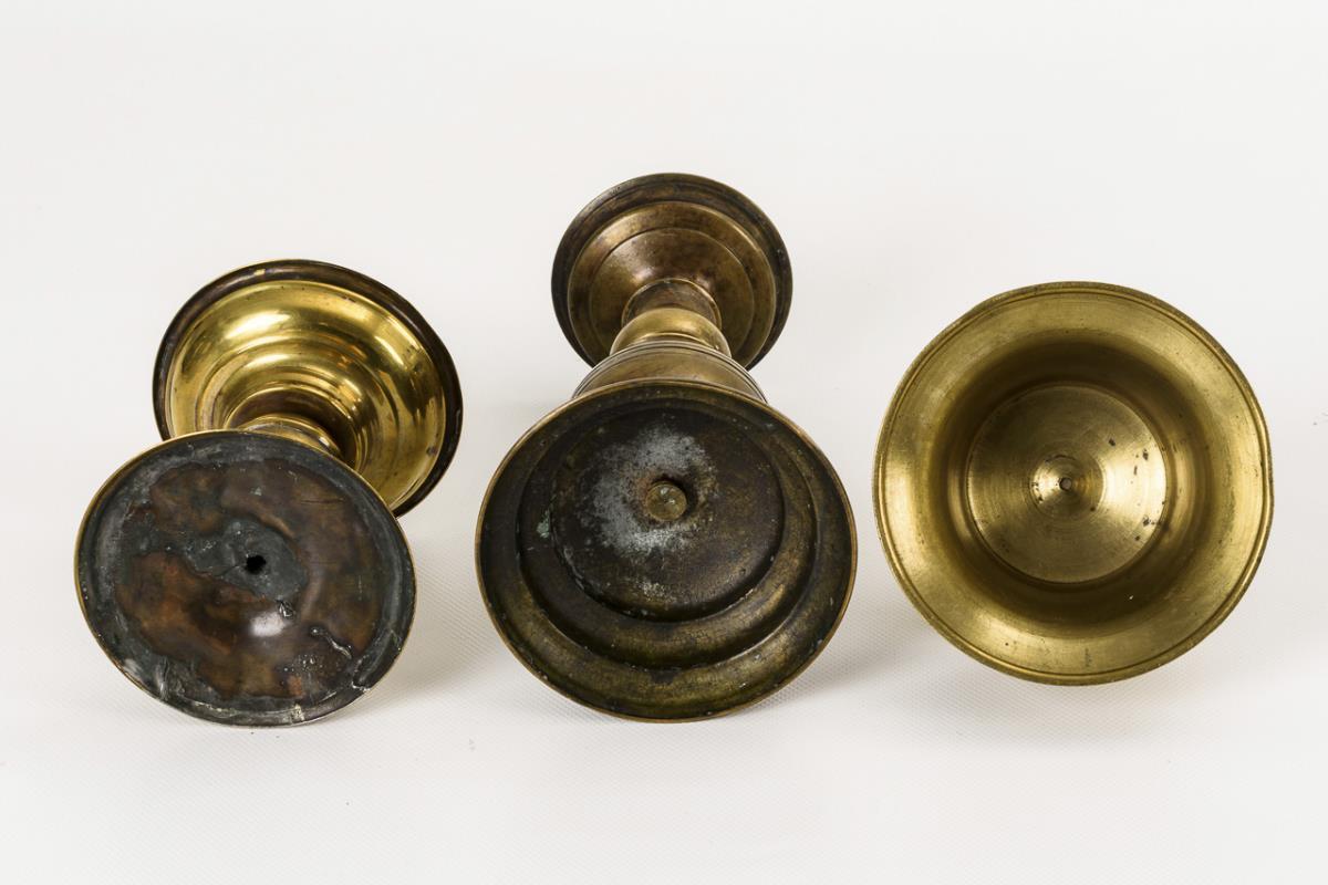 Großer Balusterleuchter in einem Stück gegossen. Kleiner Glockenleuchter im Fuß vollständig abgedreht sowie mit 2 Putzlöchern an der extra gegossenen Tülle. Kleiner Leuchter im Stil der Gotik aus Messingblech. Großer Balusterleuchter wohl für entfernte Elektrifizierung mittig durchbohrt; hier Bronzedorn ergänzt. Je geringe Alters-/Gebrauchsspuren.