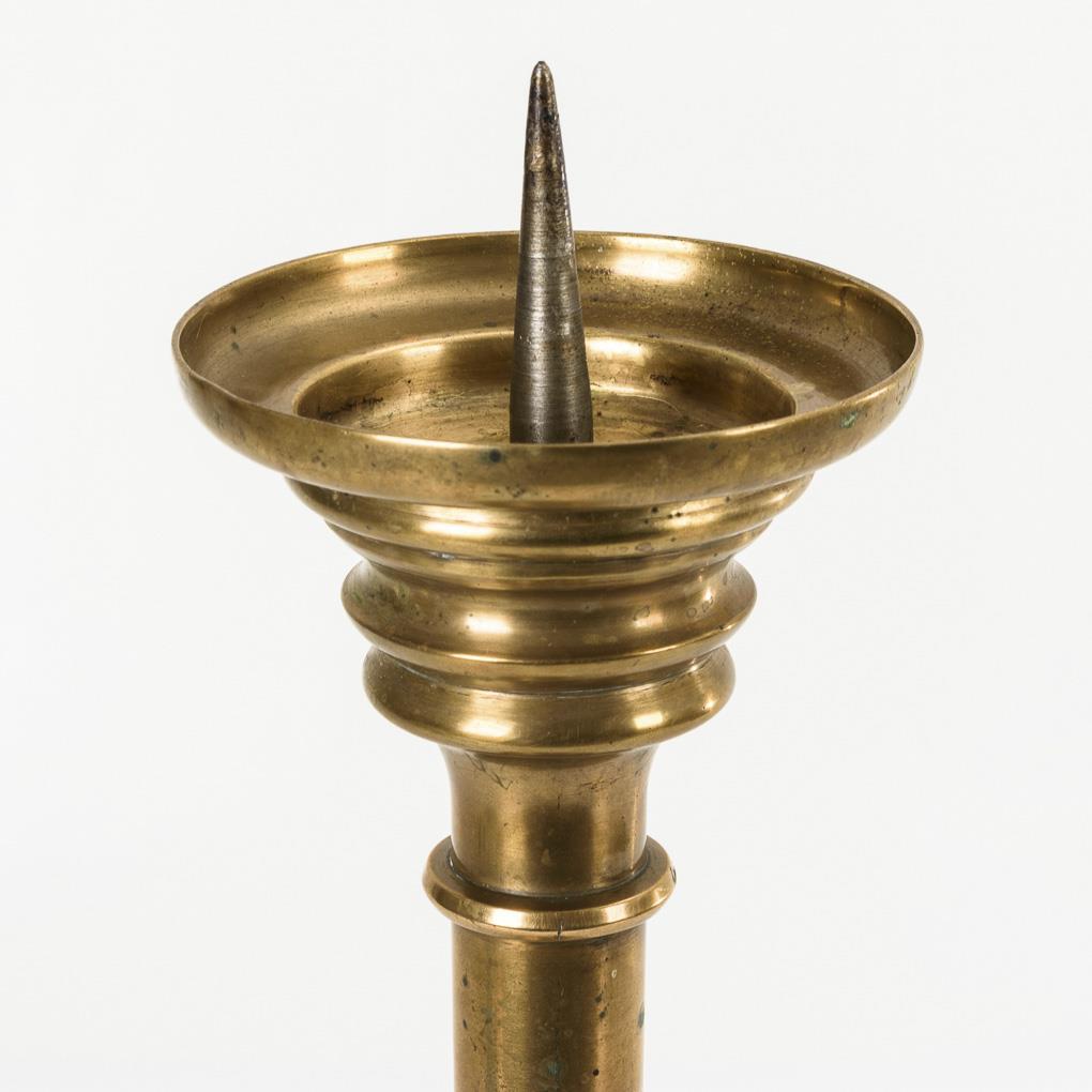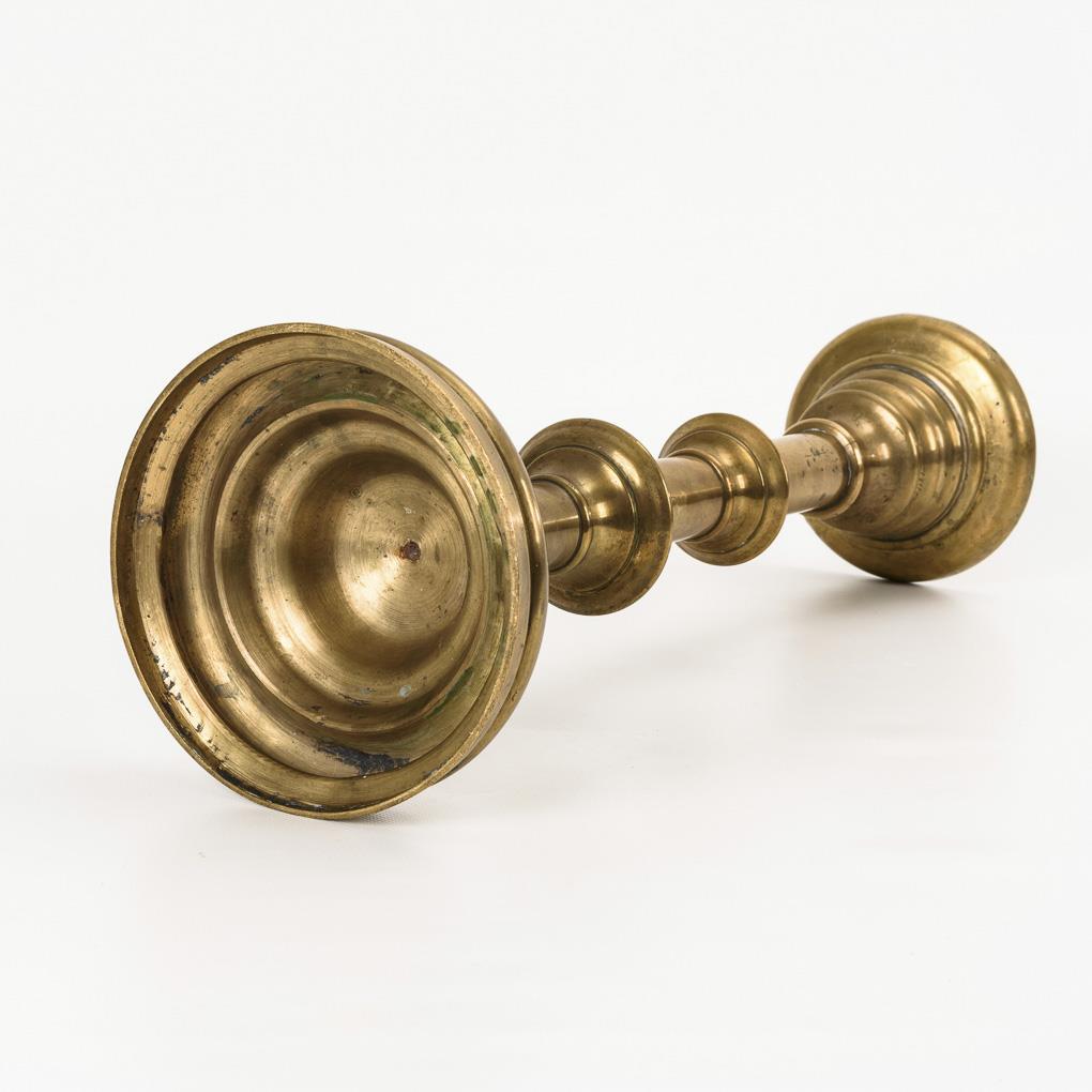 Massiver Kerzenleuchter mit gewirteltem Schaft und aufgeschraubtem Eisendorn. Leichter Schiefstand, alte Reparatur am Schaft, wenige Alters-/Gebrauchsspuren.