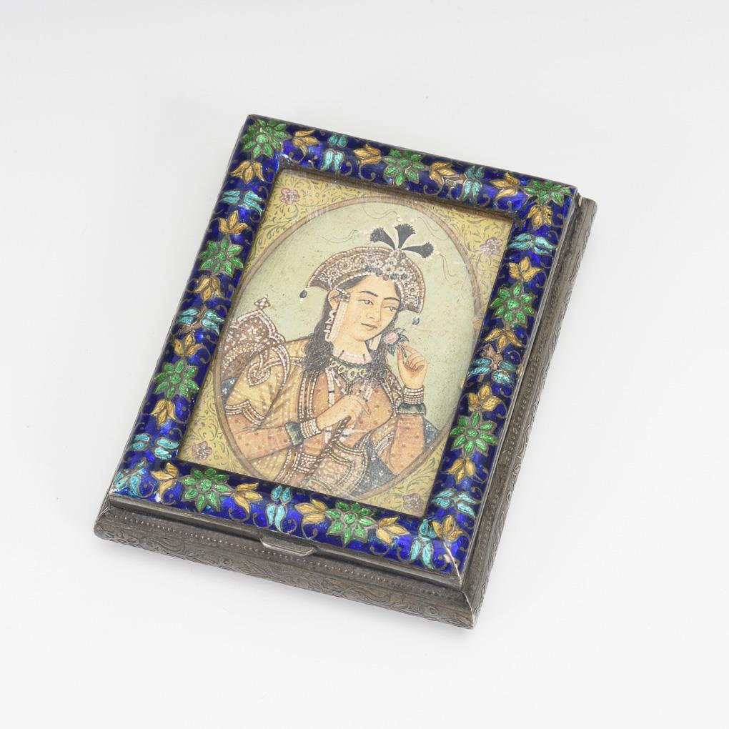 Zigarettenetui mit farbigem Emailrand. Auf dem Deckel verglaste Porträtdarstellung einer schönen jungen Frau in persischer Kleidung. Gebrauchsspuren, Boden gedellt.