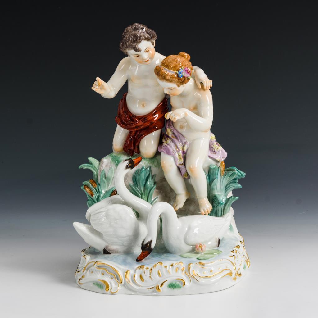 An einem Teichufer sitzendes, zwei Schwäne fütterndes Kinderpaar.
