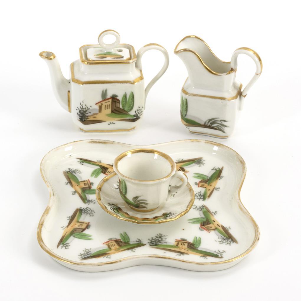 Elegantes Solitaire in Biedermeierform, mit sich wiederholender Architekturdarstellung und Goldrand: 2 Kannen und Tasse mit UT auf Tablett. Gold berieben, kleine Defekte.