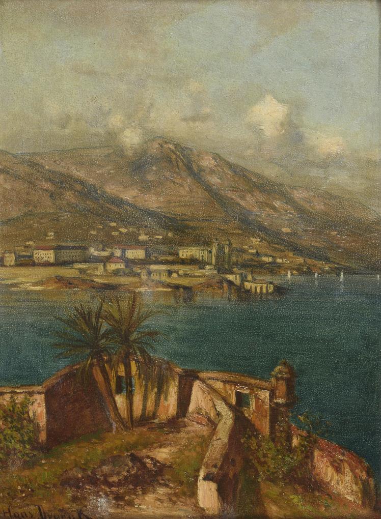 Blick von einem Hügel über die Bucht zur Stadt vor dem Gebirge.