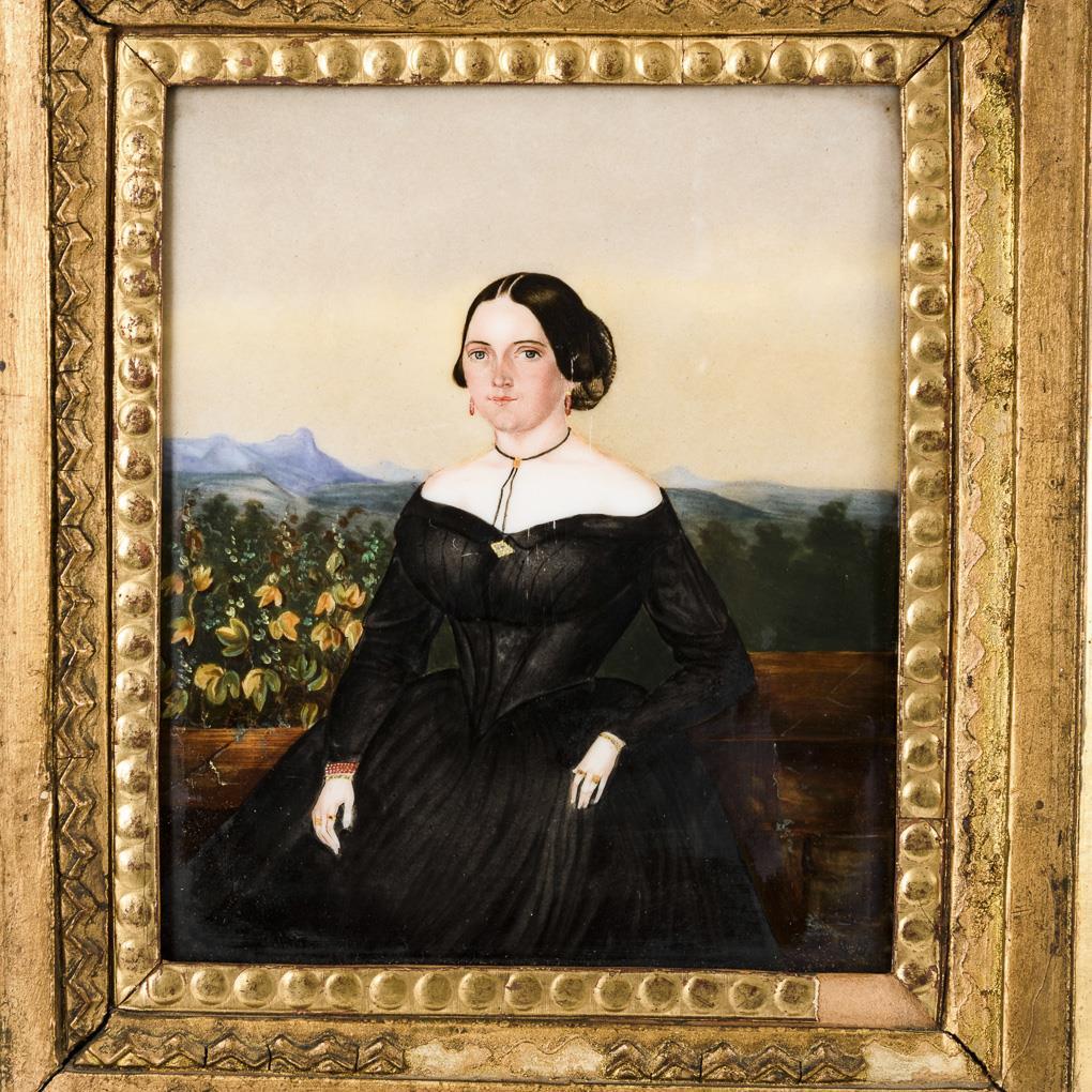 Rechteckige kleine Platte mit dem Porträt einer an einer Brüstung lehnenden Biedermeier-Dame vor einer weiten Berglandschaft. Kratzspuren.