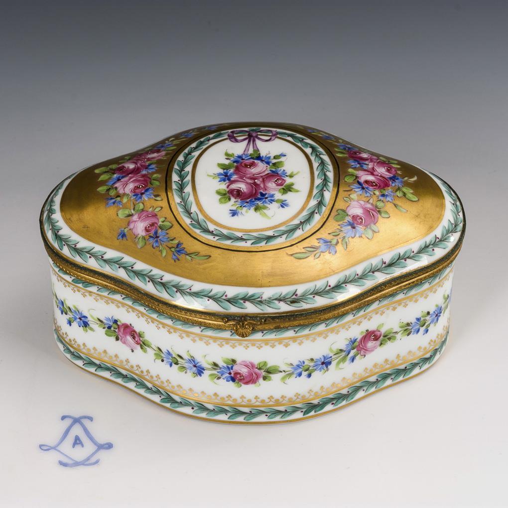 Vierpassdose mit metallmontiertem Scharnierdeckel. Auf dem Deckel goldener Teilfond, allseitig und auf dem Deckel Rosen- und Vergißmeinnichtmalerei.