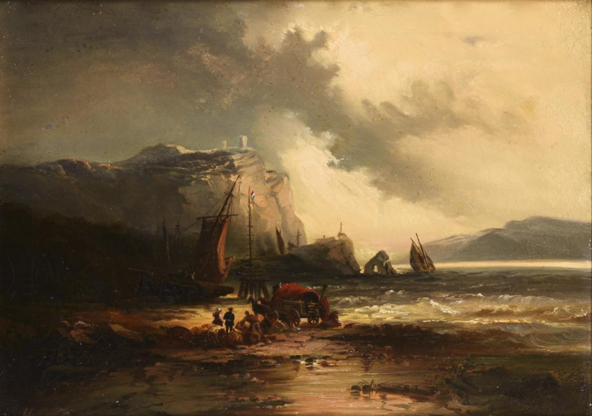 Staffagefiguren beim Einsammeln des Treibguts am felsigen Strand nahe den hohen Klippen unter wolkigem Himmel. Zwei kleine restaurierte Stellen mit Hinterklebungen.