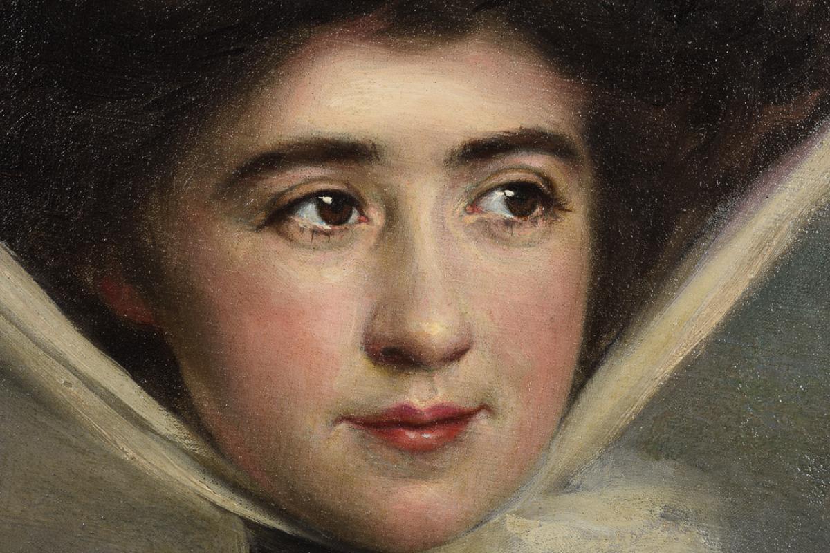 Porträt einer jungen Frau im grauen Kleid mit großem Hut und weißem Tuch. Restauriert, mit Hinterklebungen.