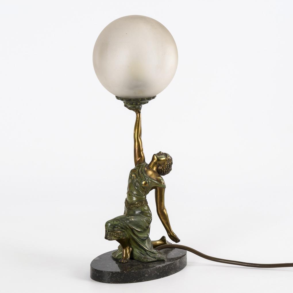 Ausdruckstänzerin im Etuikleid, die die 1-flammige Kugellampe emporhält. Funktioniert, neu verkabelt, wenige Alters-/Gebrauchsspuren.