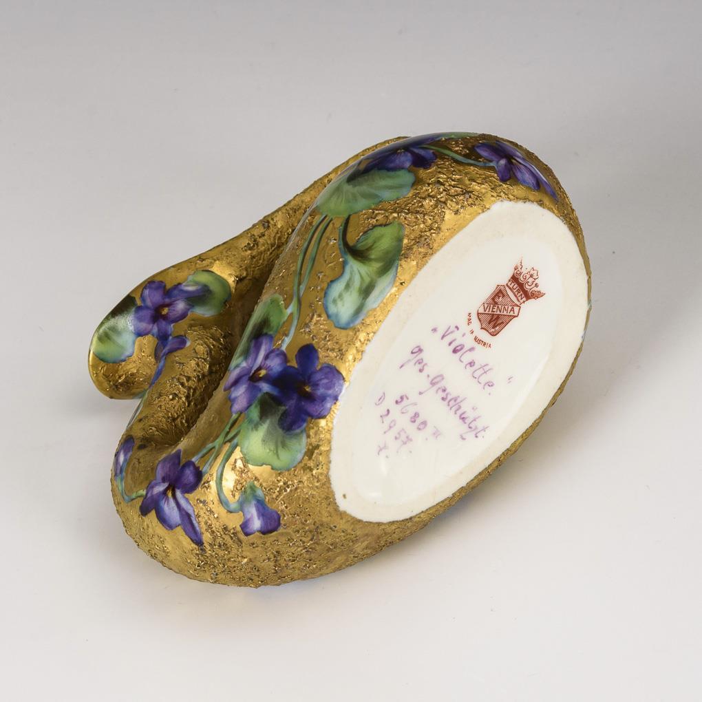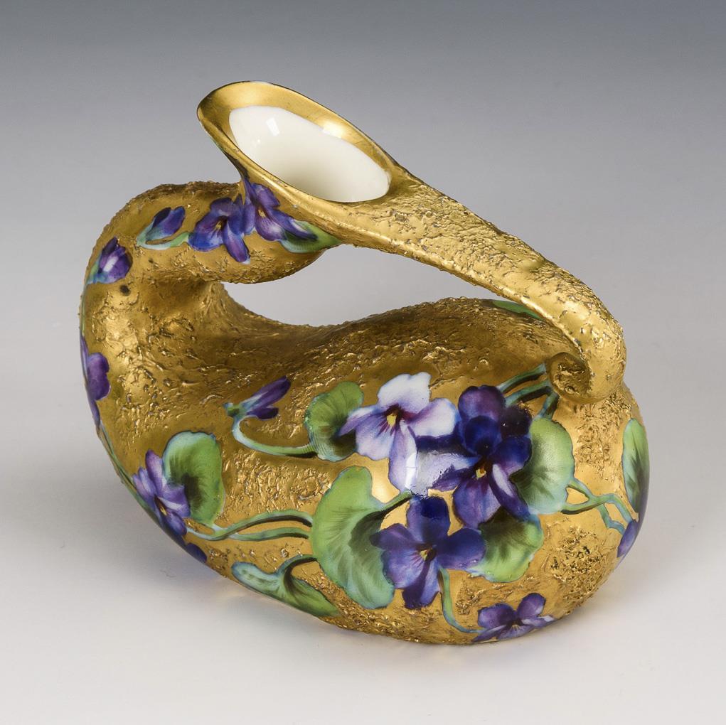 In einer schwanenähnlichen Form gestaltete Vase mit geschwungenem Hals und Henkel. Strukturierter Goldfond mit fein gemalten Veilchenstängeln. Minimale Bestoßung am Fußrand.