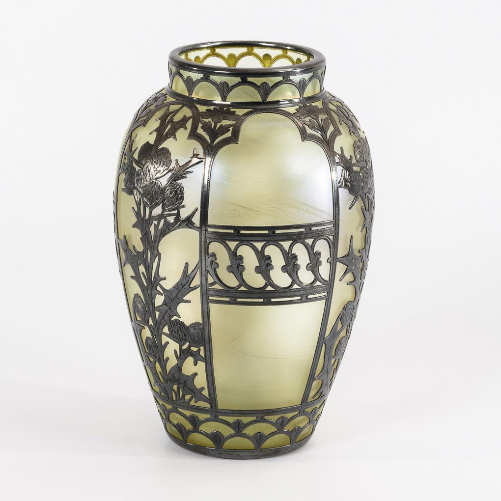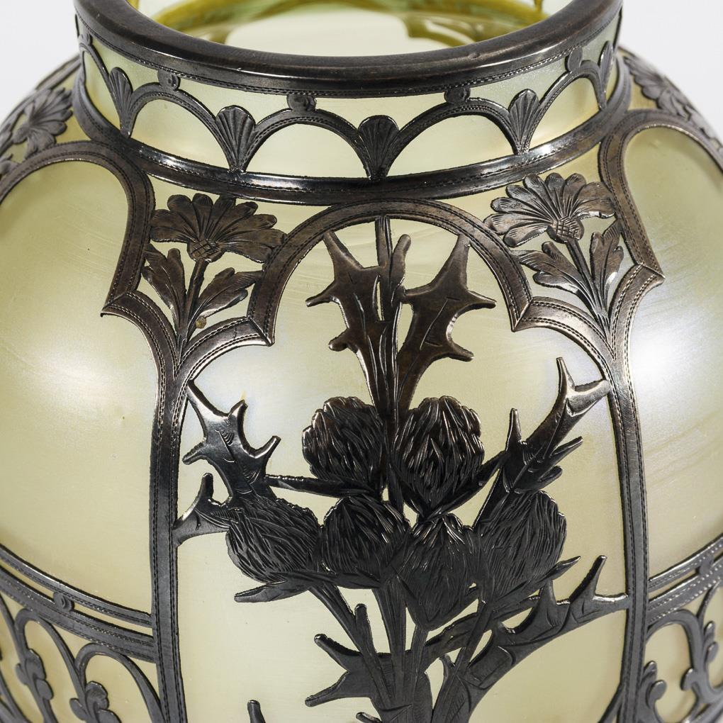 Farbloses, irisiertes Glas mit galvanischer Silberauflage. H 21 cm.