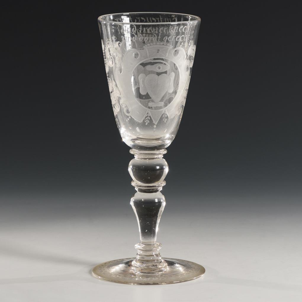 Konische Kuppa, mehrfach gegliederter, massiver Balusterschaft, Rundfuß, Abriss. Beidseitig ein von floralen Elementen flankiertes Wappenschild mit Herzsymbolen sowie der Bezeichnung "Ein treuer Herr wirth hier gelobt / und treuer Knecht und dordt gerecht".