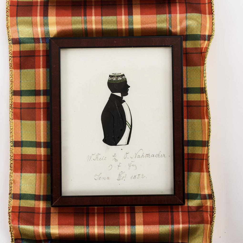 3 Studenten-Hüftbildnisse, davon 2 mit Widmungen und Zirkel der Jenaische Burschenschaft Germania sowie 3 Damenbildnisse. Je montiert am Band mit Hängeöse. 1 Verglasung im Randbereich gesprungen, sonst minimale Alters-/Gebrauchsspuren.