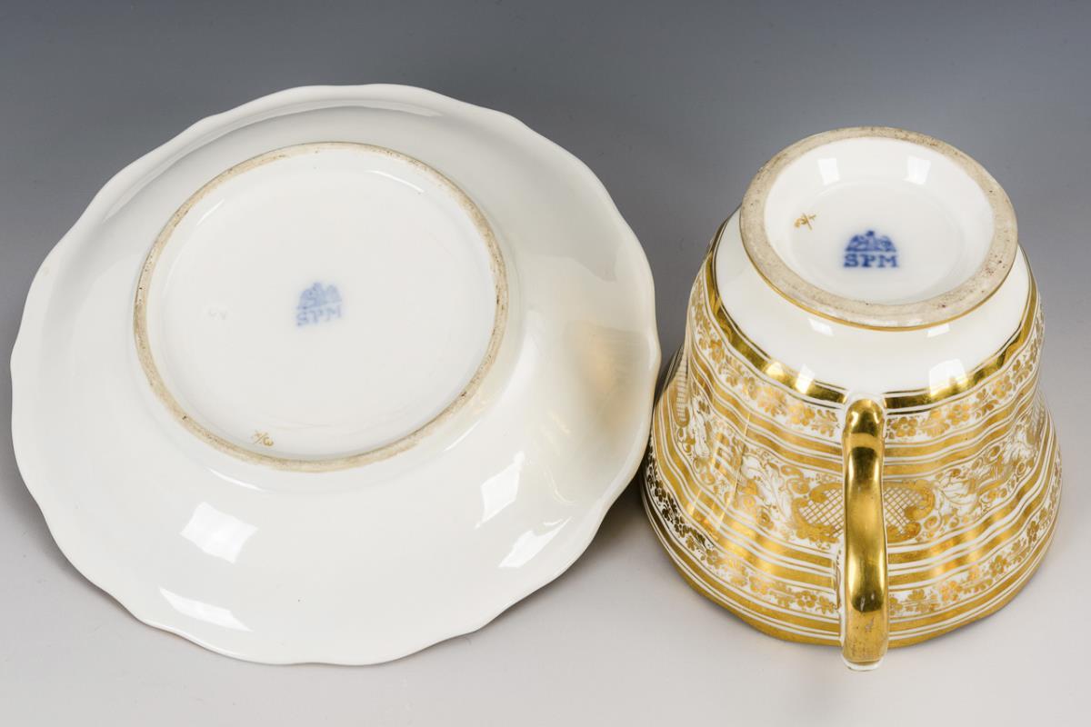 Polychrom bemalt, goldstaffiert. H Tasse 9,5 cm, Ø originale Untertasse 17 cm.