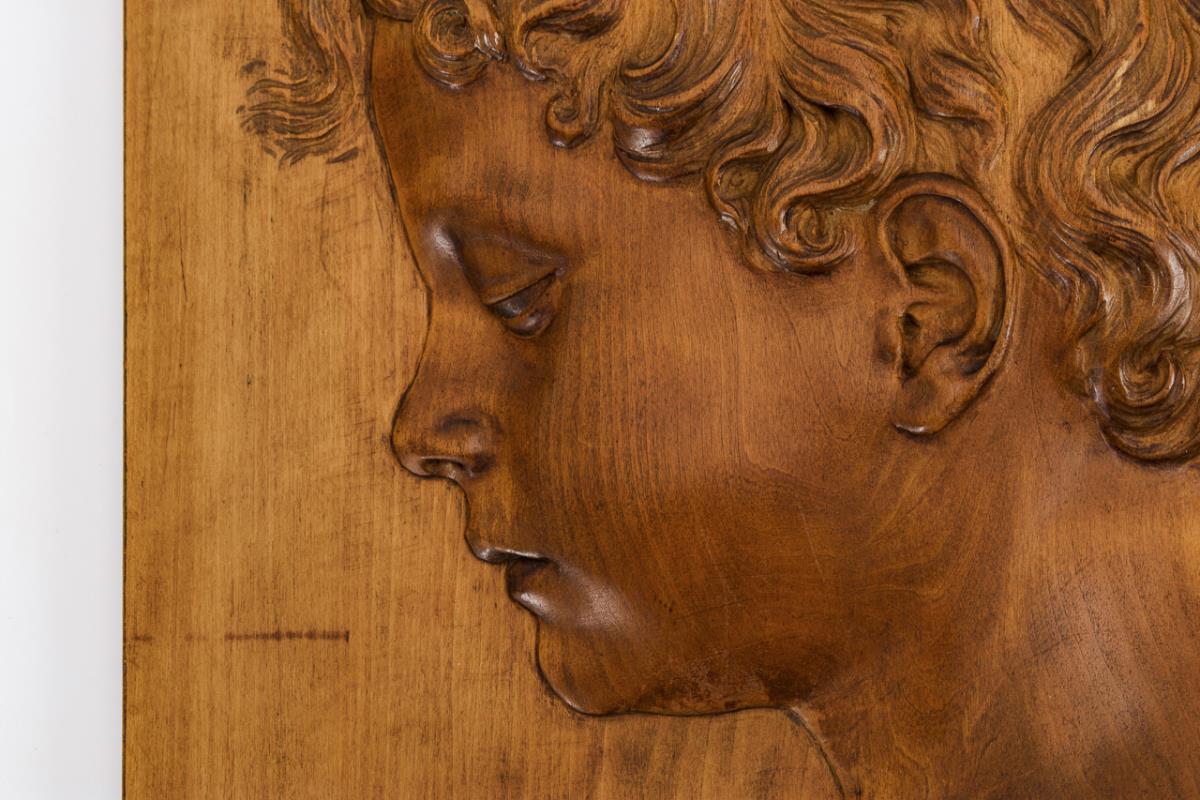 Zusammen mit dem Reliefgrund aus einem Stück geschnitztes Kinderbildnis in Form einer Reliefbüste. Minimale Alters-/Gebrauchsspuren.