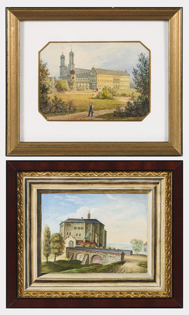 Zwei kleine Biedermeier Ansichten von Schlössern