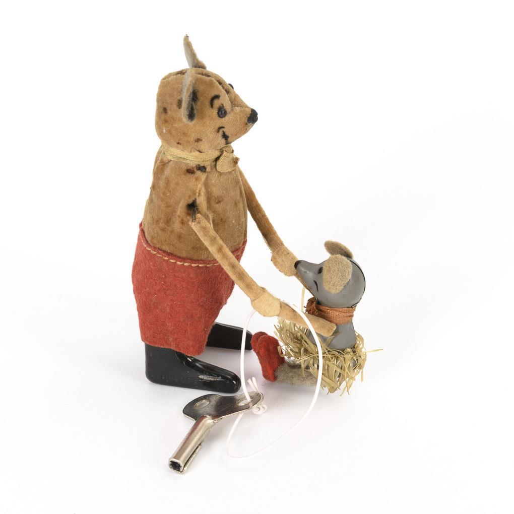 Tanzmaus mit Baby. Intaktes Werk mit Schlüssel. Altersspuren, kleine Flecken.