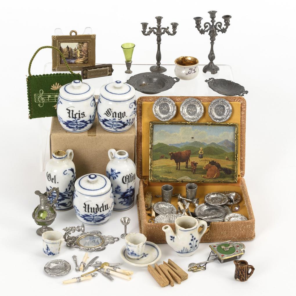 9 Teile Porzellan mit Blaumalerei, ca. 39 Teile Miniatur-Geschirr und Besteck aus Zinn und ca. 12 Zubehör-Teile für die Puppenstube (Leuchter, Wandbilder, Kanne etc.). Teils kleine Defekte.