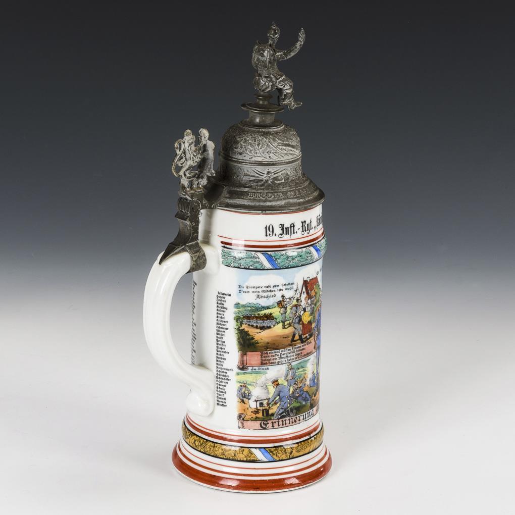 Porzellankrug mit Erlangen-Ansicht und Bildnis vom Prinz-Regenten Luitpold v. Bayern. "Karl Henning 19. Inft.-Rgt., 'König Viktor Emanuel III v. Italien' 2. Comp. erlangen 1907/09". Zinndeckel mit Löwendrücker und Infanterist als Bekrönung. / Glaskrug mit Linsen, Zinndeckel mit Tschako sowie Widmungsgravur zur 40-jährigen Mitgliedschaft im Verein ehemaliger Jäger der Deutschen Armee zu Berlin 1926.