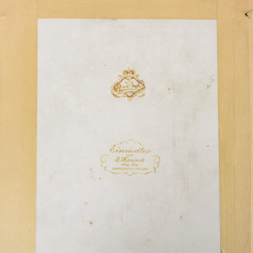 Rechteckige Platte mit der Darstellung des in einer Landschaft sitzenden, studierenden Eremiten, nach einem Gemälde von Salomon Koninck (1609-1656), verso bezeichnet "Einsiedler".