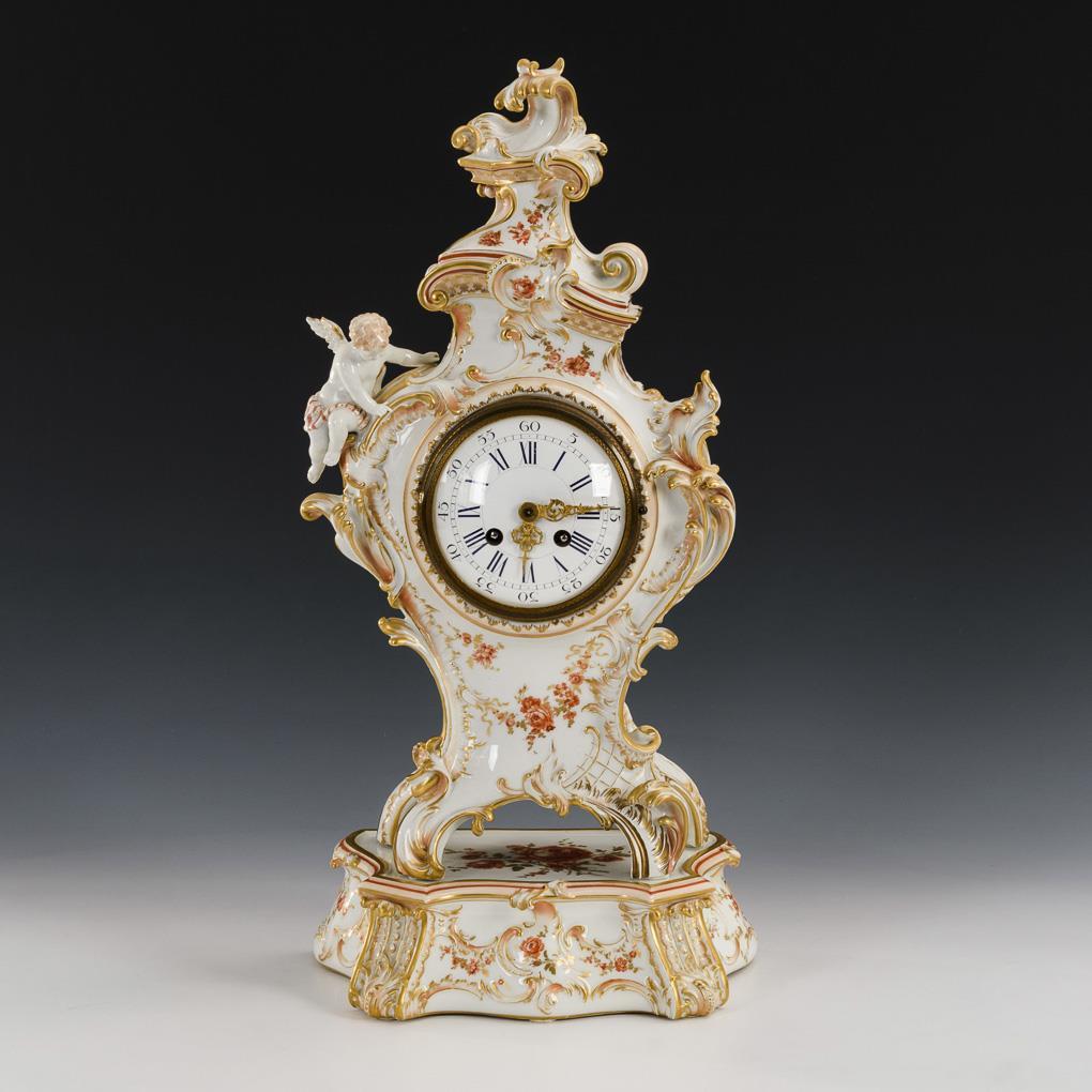Rocaillegehäuse mit Rocaillebekrönung und einem Putto sowie korallenroter Blumenmalerei. Uhr gemarkt "Lenzkirch AGU 534451", Emailziffernblatt mit römischen und arabischen Zahlen, durchbrochenen Zeigern und Halbstundenschlag auf Glocke, mit Pendel und Schlüssel. Minimaler Goldabrieb, 2 Sockelfüße und beide Puttenbeine restauriert.