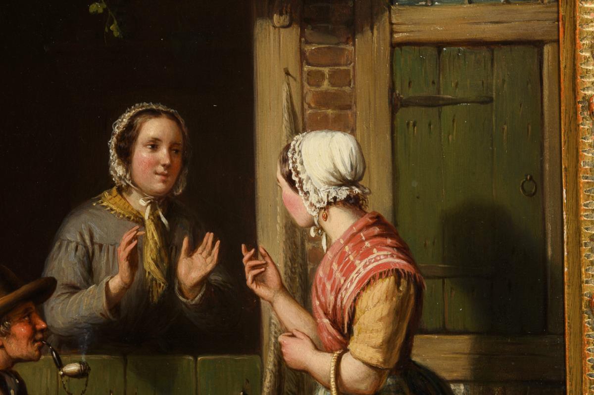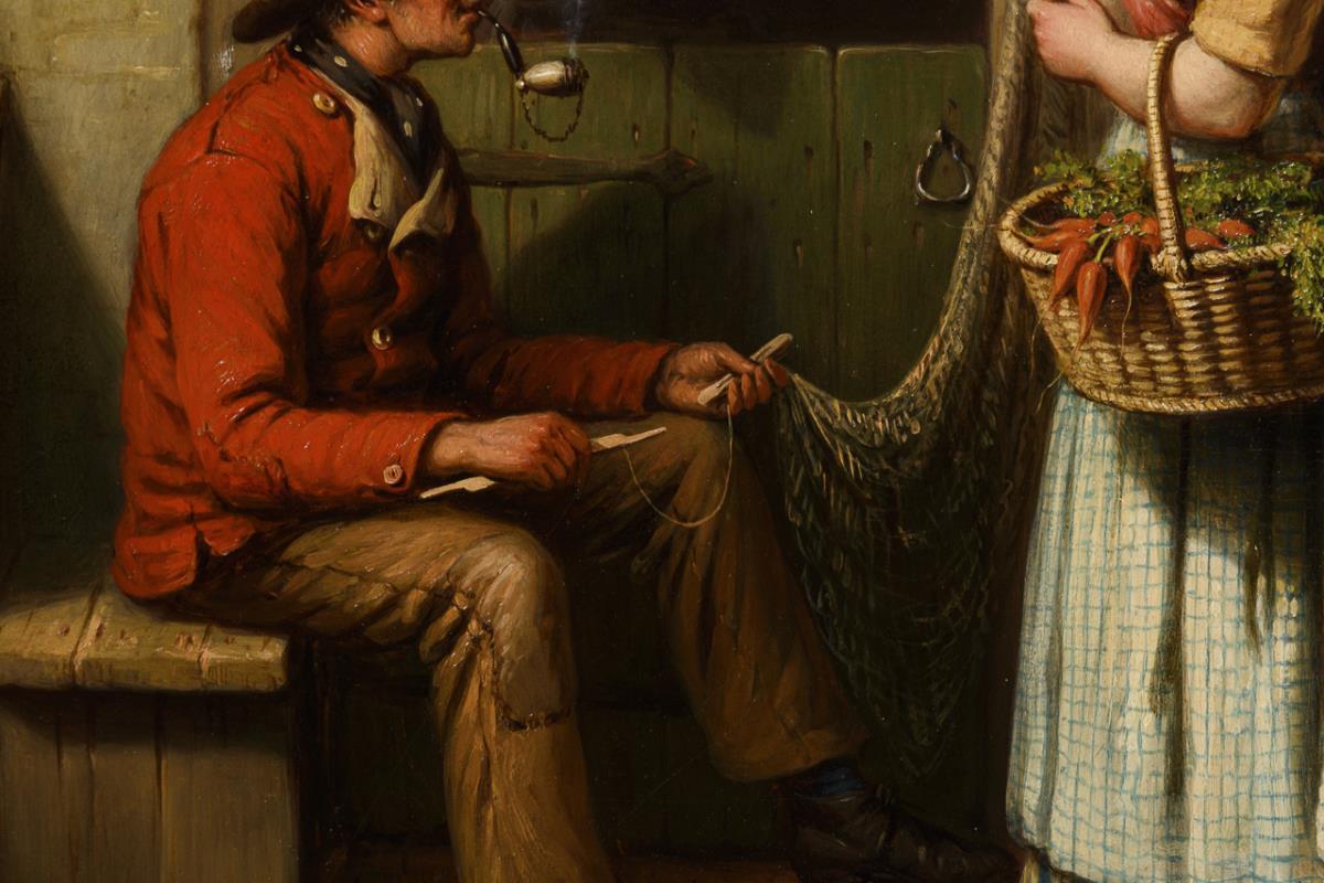 Die junge Magd mit dem Korb voller Karotten am Fischerhaus im Gespräch mit dem Paar.