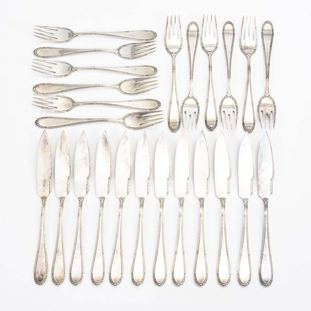 Versilbertes Fischbesteck für 12 Personen in Schatulle. WMF.