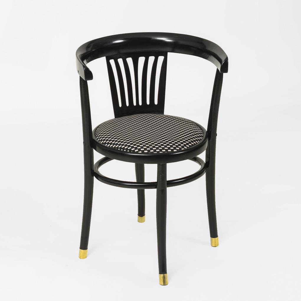Armlehnstuhl im Design-Jugendstil mit runder, gepolsterter Sitzfläche, weit gebogtem Schulterbrett und senkrecht versprosster Rückenlehne, Füße je mit Messingapplikation; schwarz-weiß-karierter Bezug. Passend dazu K (2283). Wohnfertig restauriert, Polster und Bezug ergänzt.