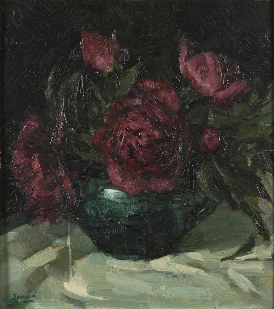 Die dunkelroten Blumen in einem Keramikgefäß auf weißem Tuch.