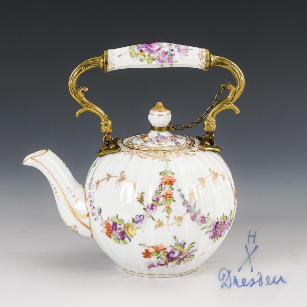Bauchige, kannelierte Kanne mit bronzemontiertem Bügelhenkel und Knaufdeckel. Umlaufend gemalte Blütengirlanden. Partieller Goldabrieb.