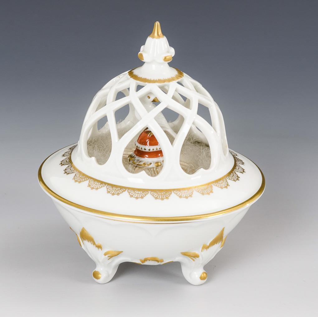 Konischer Korpus mit vier Volutenfüßen, Deckel mit durchbrochener Kuppel sowie in der Dose eine Puderquaste aus Straußenfedern mit Vogelknauf.