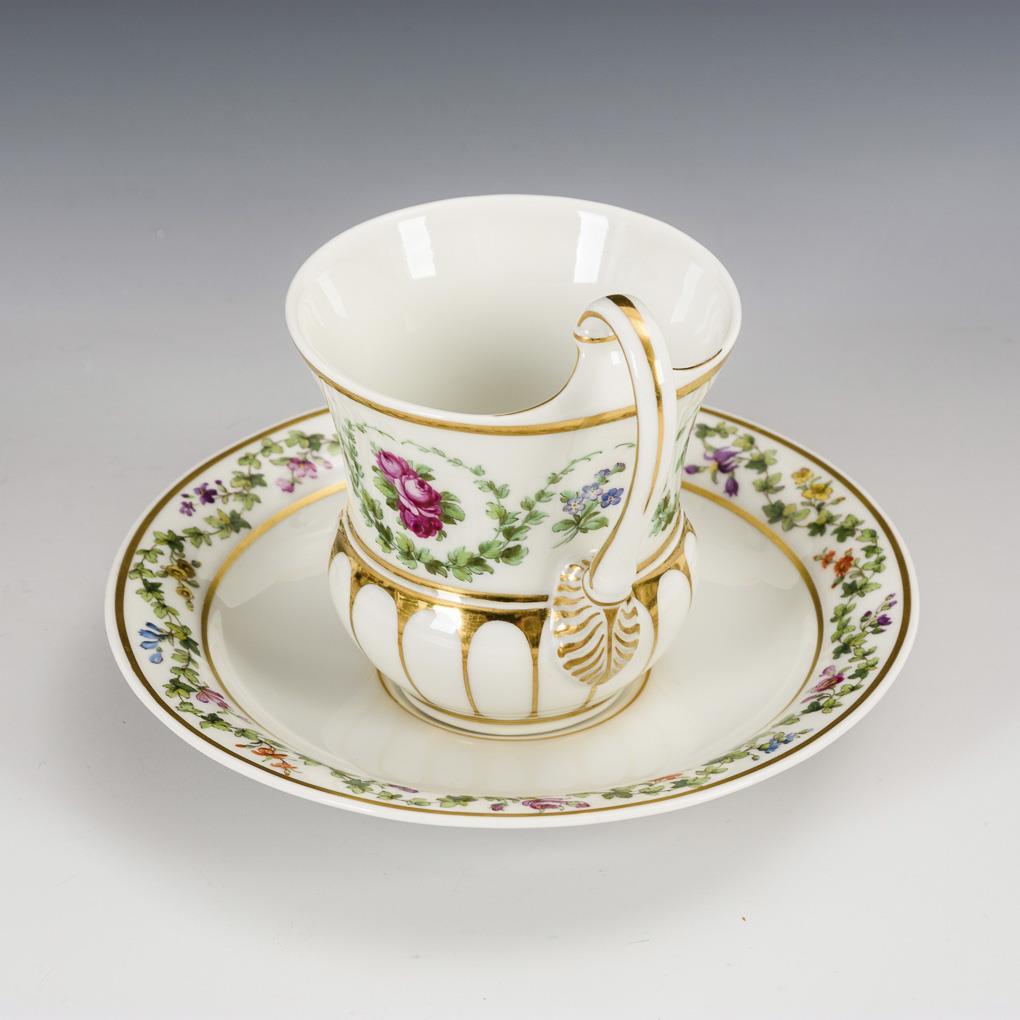 Kratertasse mit bauchigem Ansatz und Palmettenhenkel. Auf der Tasse mäandernde Blattgirlanden mit eingestellten Rosen- und Vergißmeinnichtbuketts, am Untertassenrand Blattgirlanden mit Streublümchen.